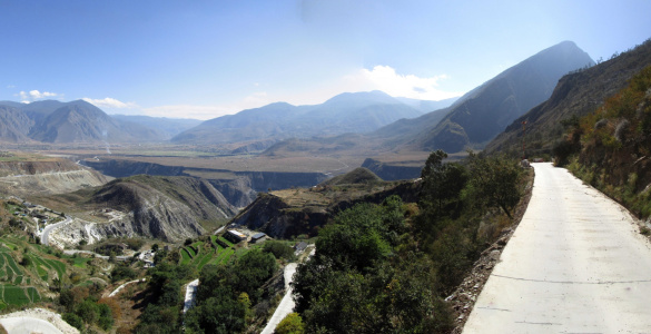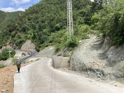 After passing a large cultivated field, follow a dirt road that switchbacks down to the top of the paved road above Benxi Village. You may have to open (and close) a gate on the way. At the paved road, a distance marker indicates three kilometers to the old Tiger Leaping Gorge highway. Arrive at the new highway one hour after leaving Water-Trough Junction. The new highway, built 2021-2022, lies roughly 50 meters higher in elevation than the old highway.