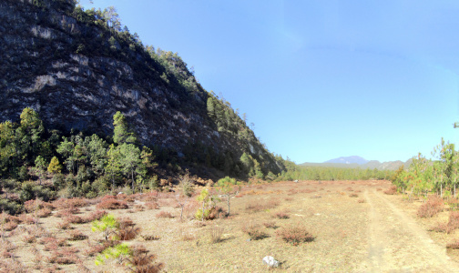 Two transmission lines and a dirt road cross over the ridge. Follow the road and cross over the ridge. Within 200 meters of the ridge crest you will pass under the first transmission line. Just beyond, the road makes a sharp left turn. Turn right here onto a path that heads south and immediately pass under the second transmission line. For the next hour the path descends gradually, first toward and then along the base of Haba Snow Mountain (哈巴雪山).