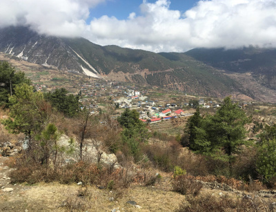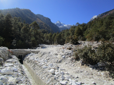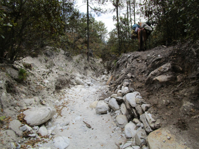 Turning right on the new highway leads to a 1.5 km-long tunnel with sidewalk for pedestrians. The tunnel opens up in the heart of the gorge and immediately joins the old highway. The road walk to Walnut Garden Village is six kilometers and takes 1½ hours with about 150 meters of elevation gain. There you will find several places of accommodation, among them Woody’s, Sean’s, and Tibet guest houses. Call a guest house for a lift if you prefer to avoid walking this stretch.