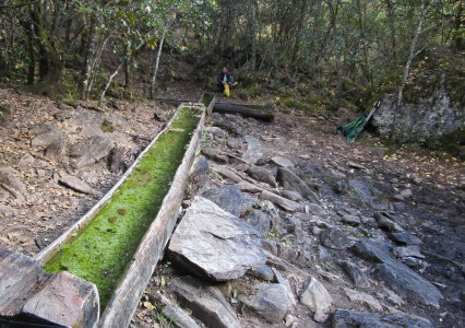 Two and a quarter hours into the trek, the Haba Muru River—more a brook than a river —provides the next landmark on the Haba-Benxi Route. Here, an aqueduct diverts water to “The Desert” in the valley below. I call it Haba Muru for convenience, as I haven’t discovered a local name. It means Golden Flower Snow Mountain in the Naxi language.