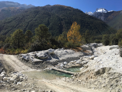 Follow the road southeast. When the road turns left downhill, follow the path straight ahead. Continue in a southeasterly direction, traversing the base of the mountain. Make a short, steep descent into a small drainage which is often dry. During high water, the drainage floods and washes sand and debris widely, forming an area of sterile ground I call “The Desert” (沙漠). The drainage deposits sometimes hinder traffic on the road between Ennu and Haba villages. Beyond the small drainage, arrive at a meadow with a view to a sub summit of Haba Snow Mountain.