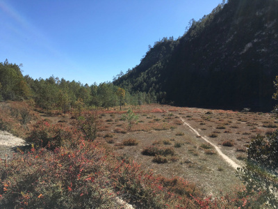 Look southeast for the next landmark—two hills, elevation 2,710 and 2,770 meters. Hill 2770 on the right (west) bears the prominent feature of a long rock escarpment. The Haba-Benxi Route navigates between the hills and traverses the flat and uniform Pancake Meadow. The north edge of the meadow sits at an elevation of 2,640 meters (27°20’12“N, 100°10’36“E).