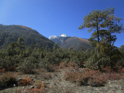Starting from Haba Snow Mountain Inn (哈巴雪山客栈) in Haba Village (哈巴村), turn left (south) and follow the road downhill past shops and restaurants. Cross the auto bridge over the Seji River (色吉河) and ascend for about 600 meters to the main road through town. At the junction, turn left onto the main road for 100 meters and then turn right onto a cement road which leads uphill to the hamlet of Longwangbian (龙汪边). The trailhead is 100 meters up this road at a break in the embankment, elevation 2,700 meters (27°22’16“N, 100°8’9“E). No car parking here. From the Inn to the trailhead takes 20 minutes.