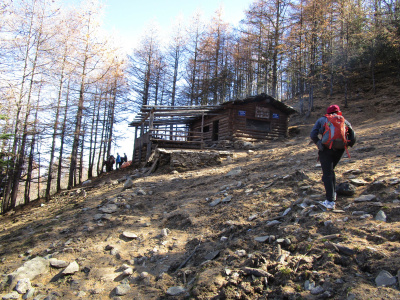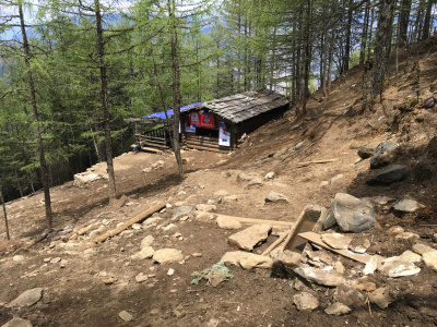 Enter the woods above Xiaoqila Meadow and continue the ascent,. A trail joins in on the right soon after. That is the Alternate Base Camp Route (备用大本营路线). 30 minutes above the meadow stands Daqila Shelter (大七拉小屋) at an elevation of 3,600 meters. This is about the half-way point to Base Camp and marks the standard lunch spot along the way. During the busy season (first week of April and October) a caretaker resides here and tends a humungus pot of noodles for hungry hikers, for a fee. Mountain guides and mule packers rest inside and boil tea over the fire. Shelter space is limited, and trekkers should not plan to spend the night inside.