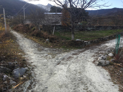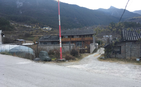Immediately after crossing the stream, turn left onto a dirt path which leads uphill through fields. Cross the main road through the village and continue on the dirt path. After a few minutes, arrive at a cluster of houses and a paved road. Proceed up the road for a few hundred meters to a rock pillar with the words “On the Clouds Inn of Haba”. The guest house is on the right, the road you want to take goes left.