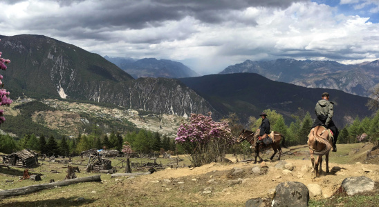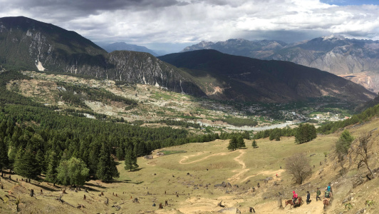 After trekking higher for an hour, arrive at the next meadow, Xiaoqila. This smaller meadow sits at an elevation of 3,400 meters. Both this and the lower Hongtupo Meadow offer good views of the Haba Valley, from the Jinsha River (金沙江) valley in the east to massive 4,000-meter high Gan Mountain (干山) to the north.
