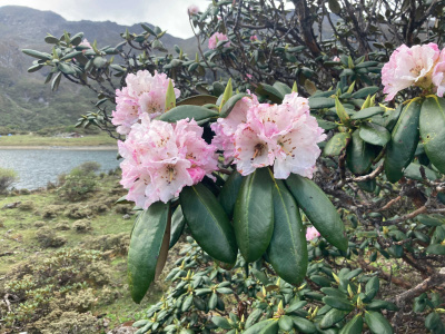 May and especially June present the prettiest time of year at Black Lake, with rhododendron trees blossoming on surrounding slopes in shades of white, pink, yellow and blue. Following the summer rainy season, autumn brings cooler temperatures. That’s when leaves of the Yehuajiaoshu tree (野花椒树, wild flowering pepper tree) turn fiery red, a flash point of color around the lake. These trees dot the northern shoreline and slopes above. The best time to view them is in the second week of October.