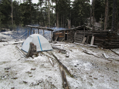 The right fork leads in 50 meters to a ramshackle hut on a bank above Yellow Lake (黄海), elev. 4,090 m. The lake remains hidden behind trees, but a path on the left leads down to the water. The hut is no longer safe for overnight lodging as the roof is unsafe.