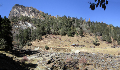 1½ hours beyond Black Boulder Junction, cross two brooks—the second on a log bridge—and arrive at Jianshan Meadow. Here, at an elevation of 3,470 meters, there are huts and corrals. You may see other hikers and local residents, as several paths converge on the meadow. The Yi Village Route (彝家村路线) crosses the meadow, going north on the descent to Yi Village (彝家村) and south on the ascent to Base Camp (大本营).