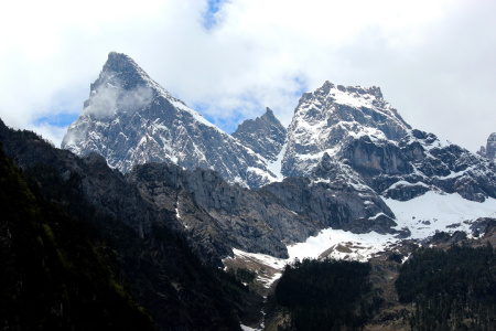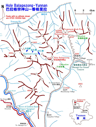 The Balagezong area, located northwest of Shangri-La City, includes two dozen peaks from 4,500 to 5,000 meters in height. The highest reaches 5,545 m. For general information on the area see here.
