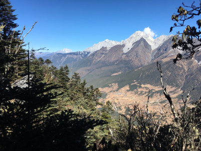 This expansive view is from atop Shika Snow Mountain (石卡雪山) near Shangri-La City (香格里拉市). Four mountain groups populate the horizon. From left to right: Noname Range, highest summit ca. 4,700 meters; Tianbao Snow Mountains (天宝雪山) with a patch of snow, main summit about 4,700m; heavily glaciated Haba Snow Mountain (哈巴雪山), 5,396m; and the slightly higher Jade Dragon Snow Mountain (玉龙雪山), 5,596m. The distance from Shika to Haba is 70 km.