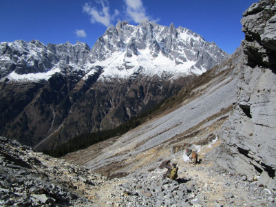 Summary: Yangma Pass (样马垭口, Sheep Horse Pass) marks the divide between Haba’s main and east summits. Expert mountaineers can mount the pass for access to Haba’s East Face. The terrain is too steep for mules.