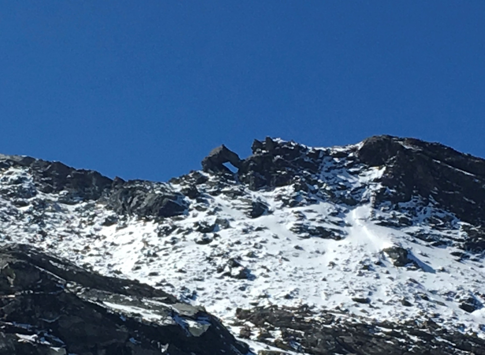 Summary: This curious hole bores through the Northwest Ridge of Haba Snow Mountain. When the sky behind is cloudless and blue, it resembles a blue dot just below the skyline. Snow Mountain Window is visible from both sides of the ridge. From the north it can be viewed at Base Camp (大本营), from the south it can be seen from the upper reaches of the Jizhi Valley (鸡枝山谷). It is also just about visible from the Access Gate on the lower section of the Lanhua Meadow Route (兰花坪路线).
