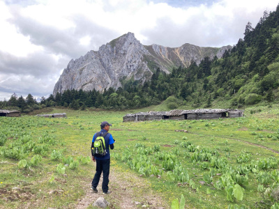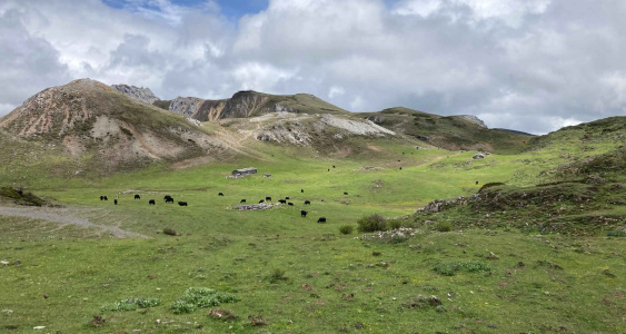 The Back Side Route trends northwest and north with minor ups and down, crossing high altitude meadows where herds of yaks gently graze. Many huts dot the landscape. Once frequented by local yak herders, the structures are falling into ruins.