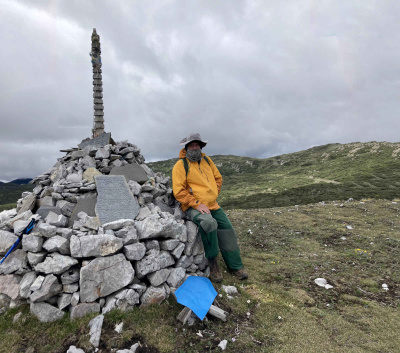 The mound of rocks includes mani stones bearing the mantra “Om mani padme hum”. Adherents of the Buddhist tradition add a small stone to the monument and pass on the left to ensure walking round clockwise.