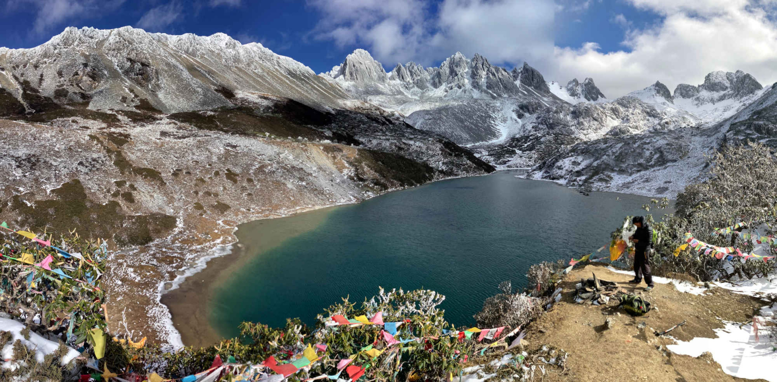 Abuji Lake (阿布吉湖) is a picturesque tarn, sacred to Tibetan people, set in a high mountain basin. The lake, elev. 4,200 meters, may be visited as a day hike from Shangri-La City.