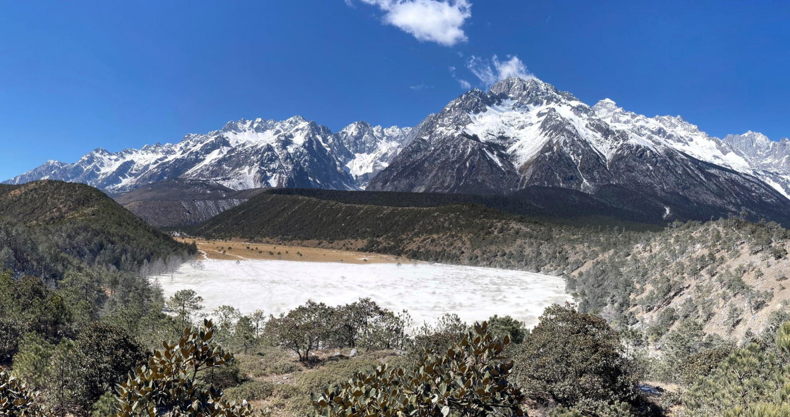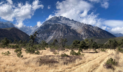 A voluminous river of ice once filled Dry River Valley. The glacier originated near the top of Jade Dragon Snow Mountain and flowed far down the mountainside. The ice is long gone, leaving behind the curved valley ringed by glacial moraines.