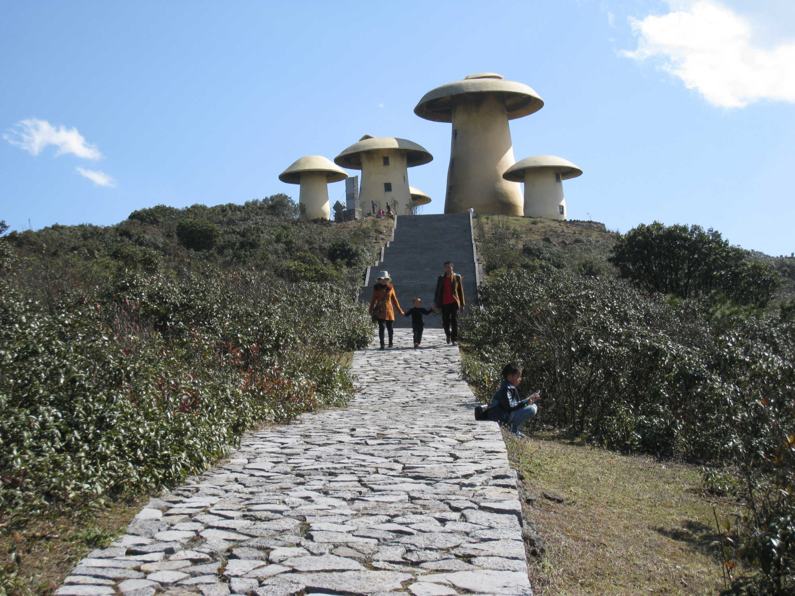 Mushroom Mountain (菌子山), an extensive tract of forests, meadows and hilly terrain, offers abundant hiking opportunities. The high point at 2,410 meters sprouts several mushroom-shaped buildings. Flowering rhodendron trees reach their colorful peak in March and April, an attraction that draws visitors from near and far. The park is within an hour’s drive of Shizong City. Read this article for details.